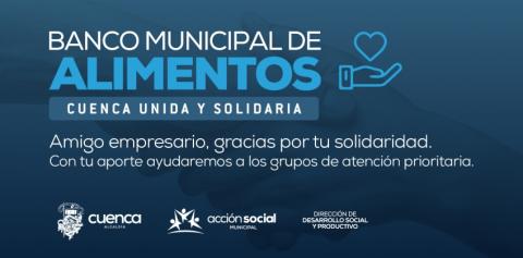 La Municipalidad de Cuenca, a través de la coordinación de Desarrollo Humano, desarrolla la campaña “Cuenca Unida y Solidaria”, con el objetivo de crear un Banco de Alimentos donde la empresa privada pueda realizar la donación de alimentos no perecibles para brindar el apoyo necesario a personas en situación de vulnerabilidad que se encuentren siendo afectadas tras la declaratoria de emergencia sanitaria en el país.