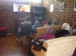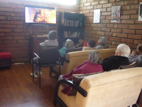 Foto 1. Se proyecta el cuento “El gigante sin corazón”. Las abuelitas y abuelitos lo ven y posteriormente se hace una recapitulación y se conversa sobre las enseñanzas que les deja la historia. Con esta actividad se refuerza la atención, la memoria, la expresión, la empatía.