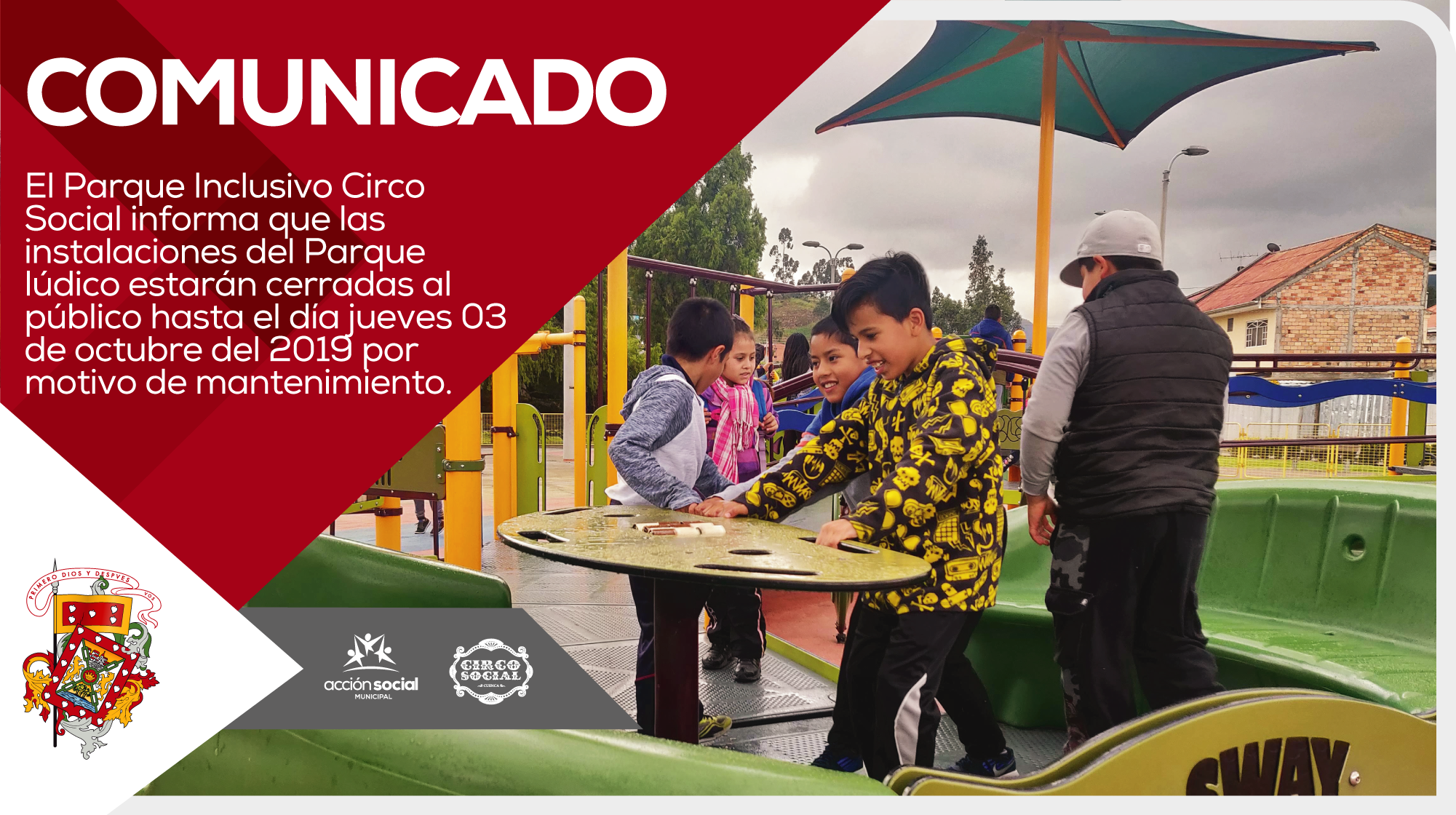 09/30/2019Hasta el jueves 03 de octubre, las instalaciones del Parque Lúdico ubicado en el Parque Inclusivo Circo Social, estarán cerradas por mantenimiento.
