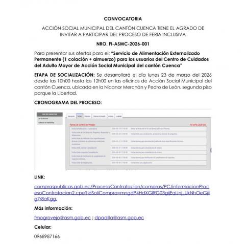 ETAPA DE SOCIALIZACIÓN: Se desarrollará el día lunes 23 de marzo del 2026 desde las 10h00 hasta las 12h00 en las oficinas de Acción Social Municipal del cantón Cuenca, ubicada en la Nicanor Merchán y Pedro de León, segundo piso parque la Libertad.