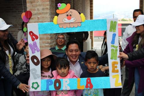 Cristian Zamora, alcalde de Cuenca, compartió este espacio recreativo con los pequeños, quienes aprovecharon para tomarse fotografías y pasar un momento de diversión con la primera autoridad del cantón.