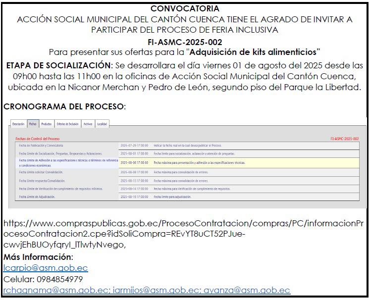 07/28/2025ACCIÓN SOCIAL MUNICIPAL DEL CANTÓN CUENCA TIENE EL AGRADO DE INVITAR A PARTICIPAR DEL PROCESO DE FERIA INCLUSIVA FI-ASMC-2025-002 Para presentar sus ofertas para la "Adquisición de kits alimenticios"